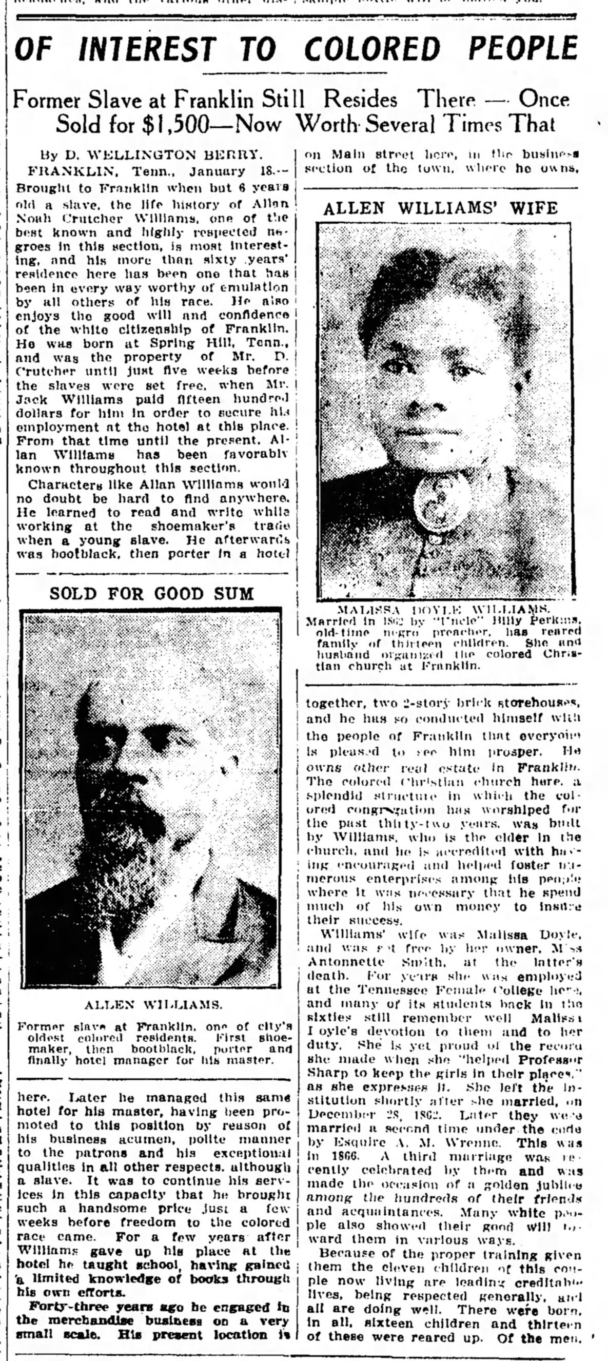 According to this article, Allen Noah Crutcher Williams (others have said his middle name was Nevills or Nelson) was "born in the [Dr. Sterling] Crutcher family at Spring Hill, Tenn., Sept. 25, 1844, and when 18 years old was sold for $1,500 to Capt. Jack Williams of Spring Hill. . . . In 1862 he married Malissa Doyle, for many years a practical nurse, who died in 1916, four years after they had celebrated their golden wedding anniversary. They had 16 children, 11 of whom are living. There are also 11 grandchildren and one great-grandchild. Several of his children are teachers and merchants."